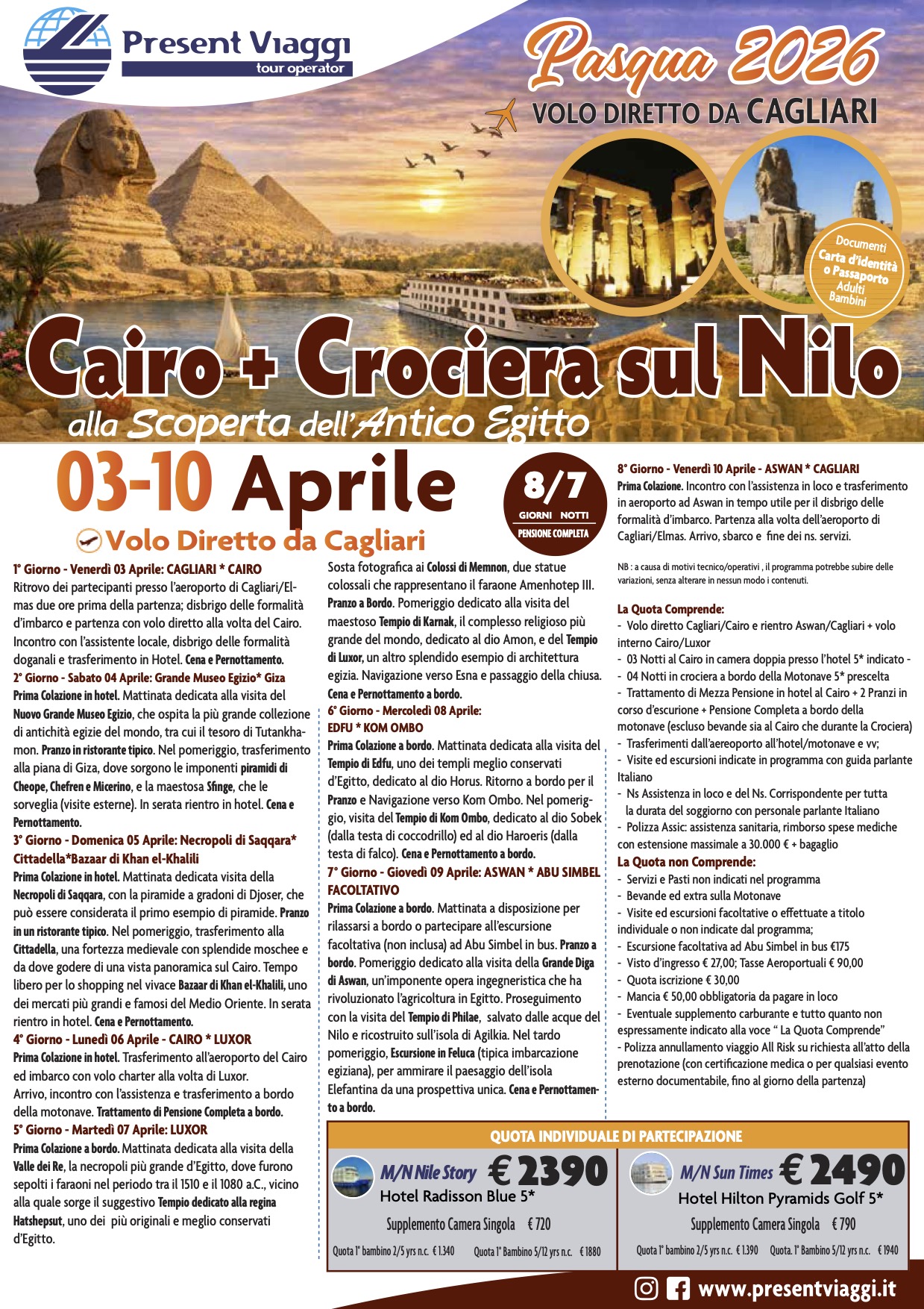 - Visite ed escursioni facoltative o effettuate a titolo individuale o non indicate dal programma, escursione facoltativa ad Abu Simbel in bus € 185
