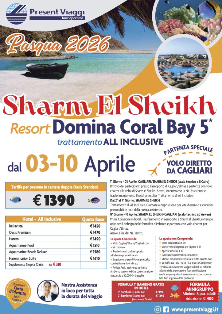 1° Giorno: Ritrovo dei partecipanti presso l’aeroporto di Cagliari/Elmas 2 ore prima della partenza, disbrigo delle formalità d’imbarco e partenza con volo alla volta di Sharm el Sheikh. Trasferimento in Hotel e sistemazione nelle Camere riservate.